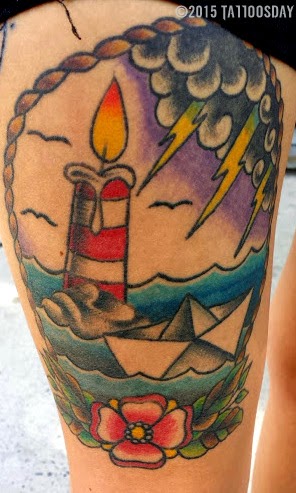 "Basically, it's the light that never goes out. You got the rain, the candle and the candle's still going pretty strong - that's guiding the paper boat."Danielle credited Matt Huff at Brooklyn Ink with this work. Most of her tattoos were done by Matt and the other artists at Brooklyn Ink.